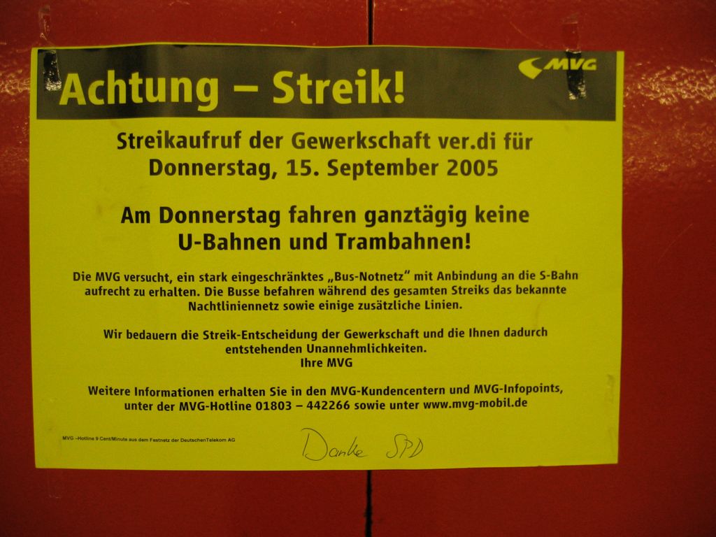 Na ja, ganz so schlimm war es dann zwar doch nicht, aber ver.di hat einen Streik bei der MVG, dem Betreiber von U-Bahn, Tram und der Mehrzahl der Buslinien im Stadtgebiet angezettelt. Es fuhren lediglich die Busse der privaten Unternehmer in einem eilig zusammengezimmerten Notnetz, das aus dem Nachtliniennetz und noch einigen weiteren Linien bestand.