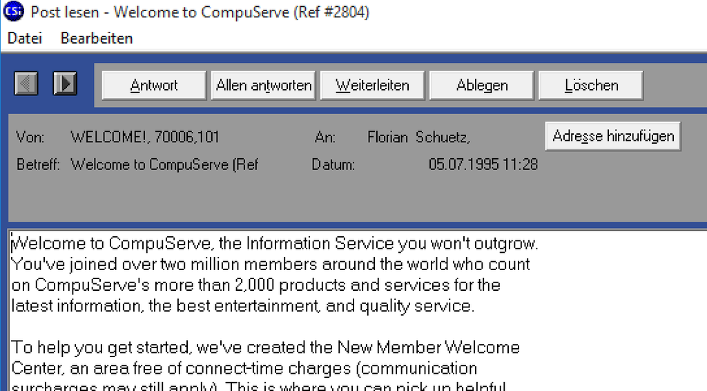 Ich bin seit dem 5. Juli 1995 online, damals war meine CompuServe-Kennung 100650,1037. Davor war ich schon immer wieder in privaten Mailboxen online, damals alles noch schön textbasiert.